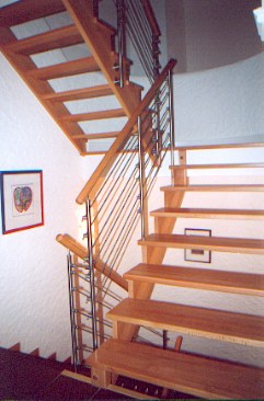 kombinierte Holzwangentreppe, Stufen wandseitig eingestemmt, auf Freiwange aufgesattelt, mit Edelstahlgeländer aus parallelen Edelstahlgurten und rundem Holzhandlauf