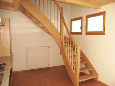 Eingestemmte Holzwangentreppe eingestemmte Holzwangentreppe mit Geländer ausmassiver Buche (ungedämpft), Holzrundstäbe 25mm wahlweise Edelstahlstäbe ohne Aufpreisoffene Ausführung, ohne Setzstufen,