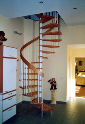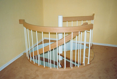 - Steiggeländer aus Holzhandlauf 120/40 mm und senkrechten weiß lackierten Stahlstäben 15 mm.