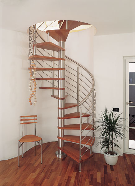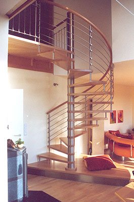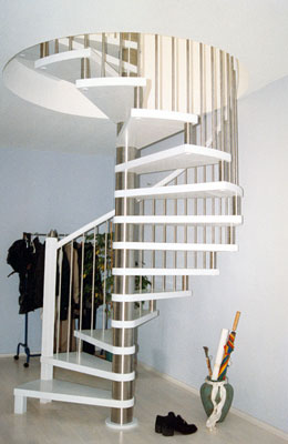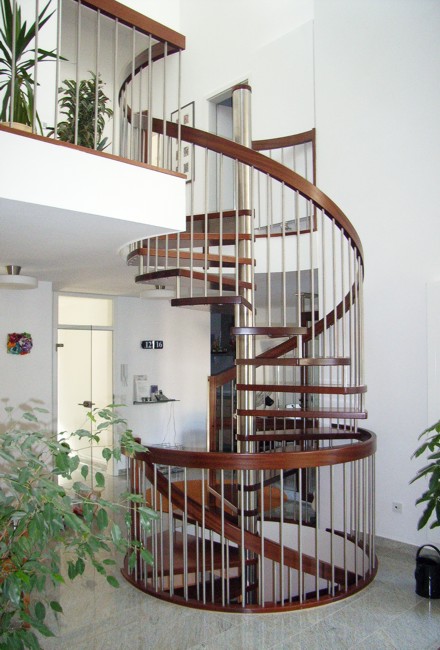 Die Treppenspindel besteht aus Holz und kann mit Edelstahl ummantelt sein.