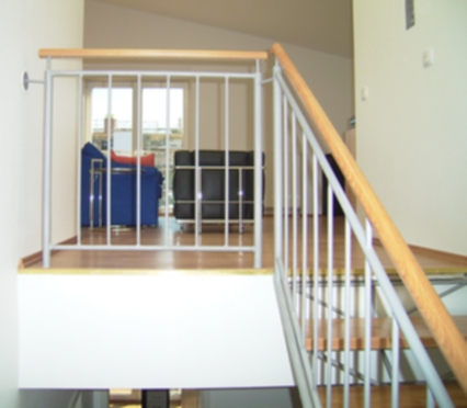 Stufenträger aus Raumtragwerk aus Stahlrundstäben mit aufliegenden Massivholzstufen, Steiggeländer aus Stahlrohr und mitlaufenden Stahlstäben. Aufgesetzter runde Holzhandlauf aus Buche mit ca. 45 mm Durchmesser. Die Stahlkonstruktion wird grundiert geliefert, die Stufen und der Handlauf sind fertig versiegelt. Bei dieser Konstruktion sind nur gerade Läufe mit oder ohne Zwischenpodest möglich.